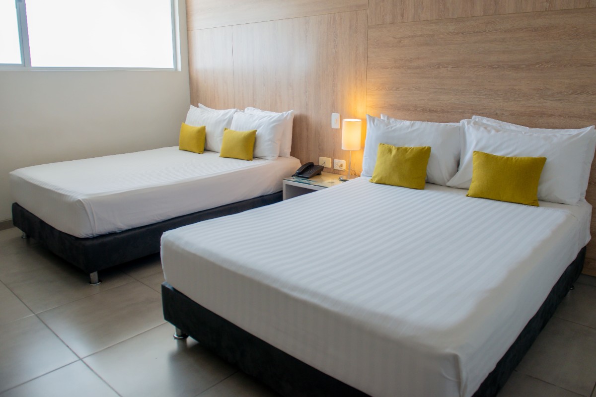 Habitaciones con dos camas dobles frente al área de la piscina, con un ambiente acogedor y distinguido, con todo lo necesario para sentirse como en casa.